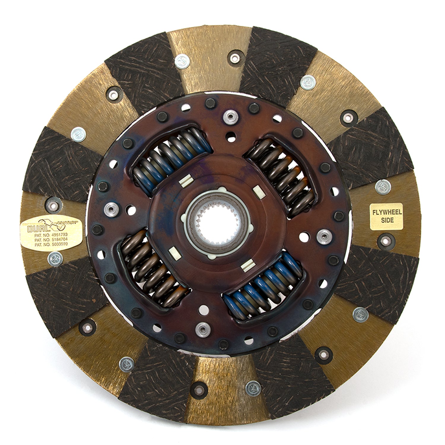The Centerforce(R) Dual Friction(R) Clutch Series is a performance matched pressure plate & disc combination featuring the patented Centerforce centrifugal weight system (where applicable) and specialized machining processes to provide a performance clutch that offers exceptional street characteristics, while offering outstanding holding-capacity and durability. Furthermore, the Centerforce Dual Friction disc has an organic full facing on one side for longevity and an organic segmented facing on the other side providing increased holding capacity. Some applications have the organic segmented facings of both sides. The Dual Friction clutch is engineered for those who are looking for the ultimate in street/strip holding power and performance without sacrificing pedal effort and driver control. While the Dual Friction has been engineered primarily as a street clutch it can be used in mild competition applications.