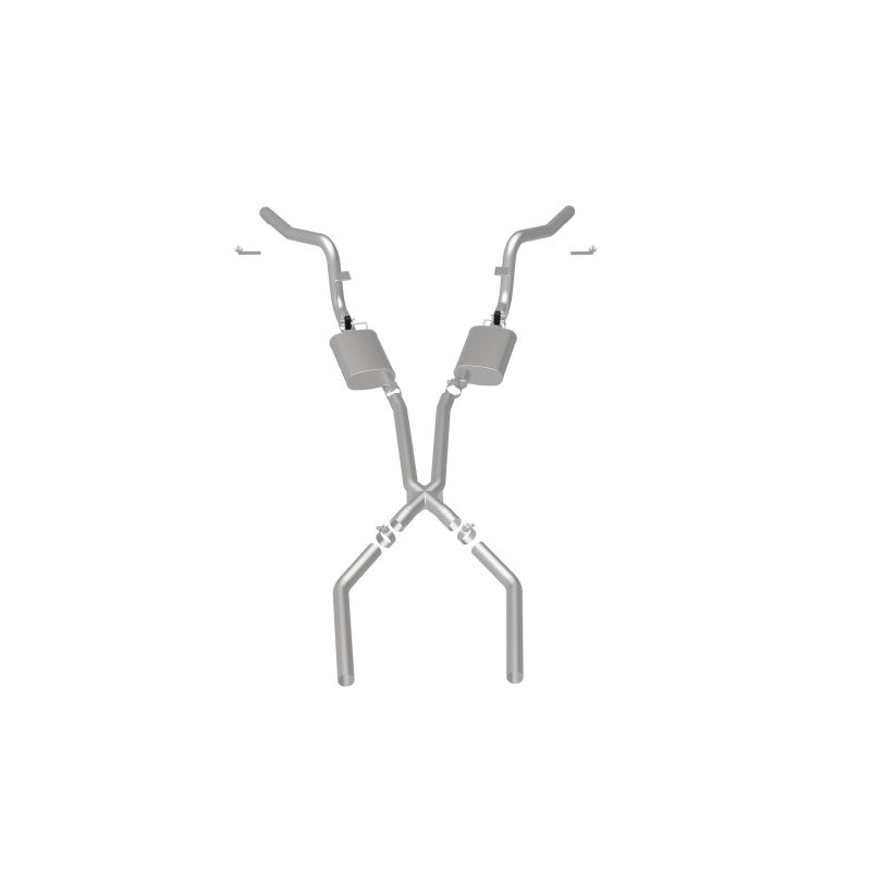 The MagnaFlow Street Series Crossmember-Back Performance Exhaust System 15896 brings enhanced engine sound and dyno-proven performance to your muscle car with a healthy helping of our deep, resonant signature exhaust note at Moderate exterior and Mild interior sound levels. Thanks to its durable, corrosion resistant stainless steel design, this exhaust system will handle whatever tarmac you decide to leave your mark on. This performance exhaust kit features a crossmember-back layout designed to replace your exhaust system from the crossmember on back. With its fast-flowing, mandrel bent 2.5in. main piping and 2 Straight-Through mufflers ending in a Dual Split Rear exit that you can enhance with tips of your choosing, your muscle car will be sounding as awesome as it looks. Extensive 3D scanning during development has resulted in a direct-fit design that you can easily install yourself. 15896 is produced using CNC precision robotic manufacturing techniques and is backed by MagnaFlow's limited lifetime construction warranty.