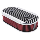 The Edelbrock Elite II Oval Air Cleaner #4272 for dual-quad applications features an updated design that is influenced by the original Elite Series from 1985. The Elite II is made from heavy-gauge, die-cast aluminum and is finished off with a show-quality high-luster polished finish. The raised fins are accented by a contrast gloss black finish between the fins for the definitive Elite Series look. The Elite II Oval #4272 Air Cleaner fits low-profile dual-quad applications with a 6-7/16-inch center-to-center spacing. Includes black anodized knurled nuts and a high-quality 3" pre-oiled, washable and reusable Pro-Flo Universal filter with the exclusive Pro-Charge clean strip for easy maintenance and excellent filtration. Our oval air cleaners are designed to fit Edelbrock single- and dual-quad applications and should clear HEI distributors and stock parts. Overall oval air cleaner dimensions are 13-5/8" x 7-3/16.