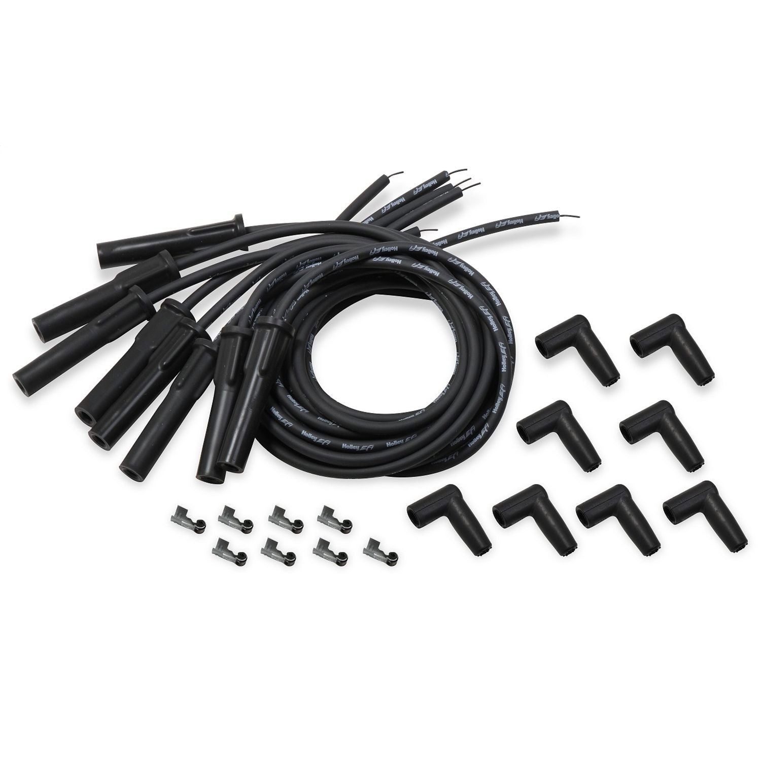 Holley EFI Universal "Cut-to-Fit" spark plug wire sets for GM Ls Engines come with the spark plug terminal and boot installed with the Coil end unterminated. Coil cap boots and terminals are included so you can cut the wire to the desired length, then install the terminal.