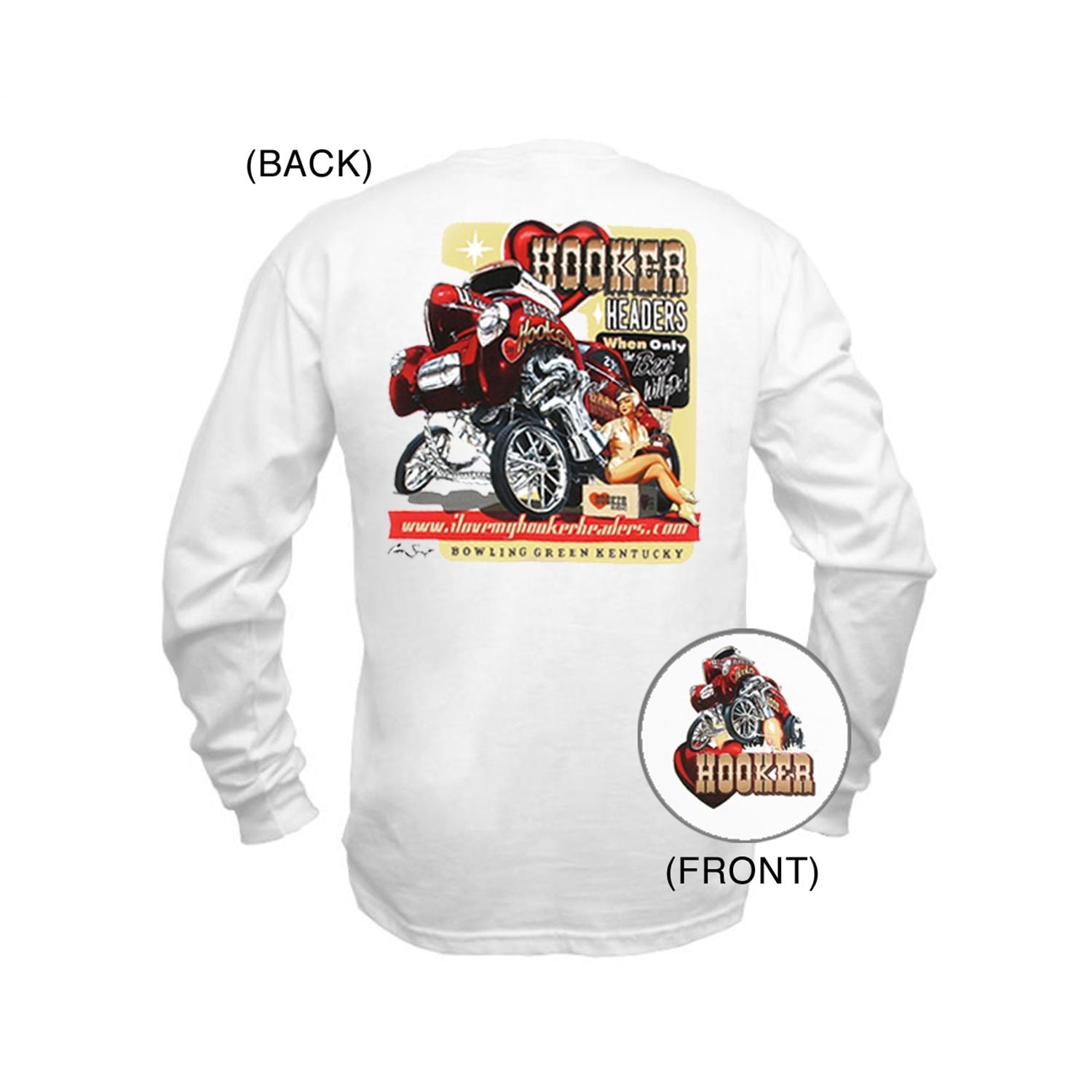 The new Hooker retro pin up girl t-shirt features a killer gasser-style Willys. An exaggerated set of Hooker fender-well exit headers set it off while the classy pin up girl sitting on the Hooker Headers box takes this retro T to the next level! Artist Christ Froggett showed his talents again on this one and the Hanes Beefy Tee is sure to please as well. This long sleeve shirt comes in small to 3X.