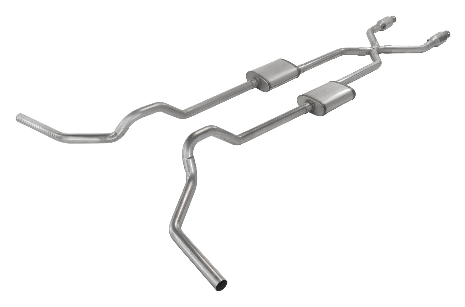Crossmember Back w/X-Pipe Exhaust System 75-87 GM Split Rear Dual Exit 2.5 in Intermediate And Tail Pipe Violator Muffler/Hdw Incl Tip Not Incl Natural Finish 409 Stainless Steel Catalytic Converter Incl Pypes Exhaust
