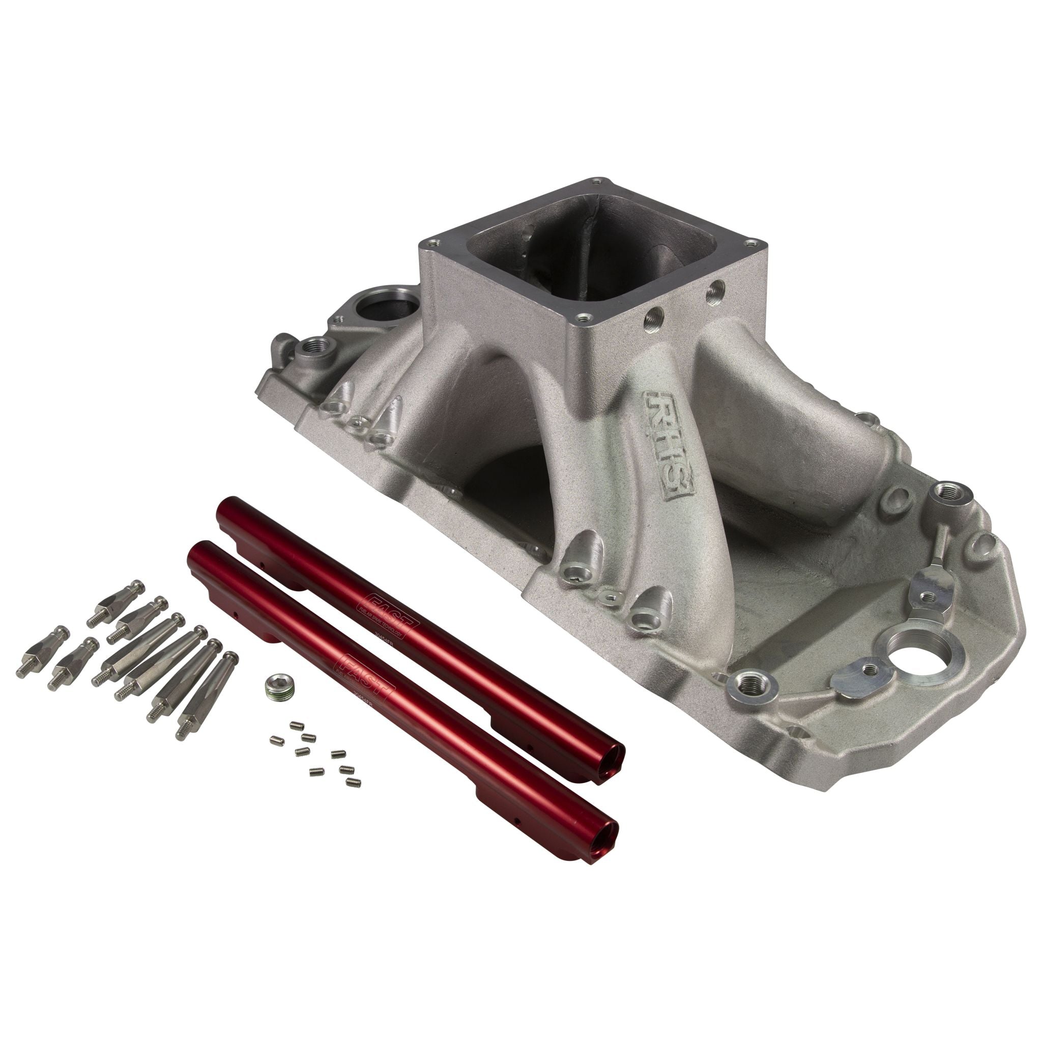 These manifolds are designed for maximum airflow and power with a 4500 Dominator-style carburetor flange. Engineered to fit most 24-degree style race cylinder heads, RHS took additional efforts to ensure excellent port matching when paired with RHS Big Block Chevrolet cylinder heads. These manifolds are available in both carb and EFI versions and offer excellent performance for drag racing and marine applications. Featuring a single-plane design, they utilize individual runner dividers for excellent throttle response and exceptional torque. Available for both short and tall deck blocks, all versions utilize a standard BBC distributor – there is no need for a slip collar distributor or special distributor for tall deck engines. They feature auxiliary water ports, an integral water crossover and dual distributor hold-down pads. Ports for water lines are also provided at all four corners. RHS also teamed up with sister brand FAST to create a revolutionary EFI version of the manifold that features port angle optimized injector bung mounting and machining, which angles the injectors to point directly at the valve. In addition, the EFI manifolds feature integral sensor mounting points to improving function, fitment and packaging.