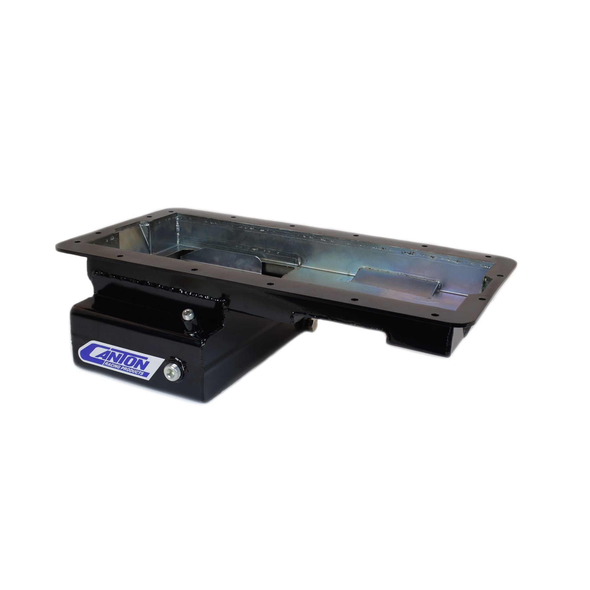 Cantons new black powder coat 15-738 Ford 5.0 Coyote oil pan is designed for early Ford chassis and others that required a front sump oil pan. The pan is designed with a ?t?sump for extra capacity and is used in road race applications where ground clearance is important .It features a diamond shaped road race baffle assembly with four trap doors and a removable Windage/anti-slosh baffle.