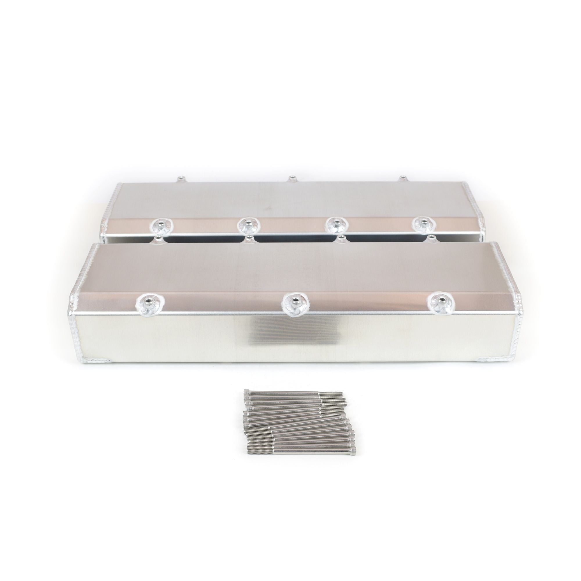 This BBC fabbed aluminum valve cover comes plain with no holes. This fabricated valve cover is designed to be light weight, yet strong enough to prevent warpage. It is constructed from .100" aluminum, with heavy wall mounting tubes and is welded on cylinder heads to a insure proper fit. Fill bungs, AN fittings, or breather stacks can be installed on a special order basis. Stainless socket head mounting bolts included.