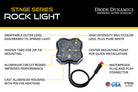 FeaturesHigh-power RGBW LED functionConvenient center-mount installationControl with remote or Bluetooth appAluminum construction with pin-fin heatsinkDurable UV-coated lenses engineered to spread lightEngineered and Assembled in USAOverviewIntroducing the Stage Series Rock Light from Diode Dynamics! These USA-assembled units are a major step up from any other multicolor rock light on the market today. Rock lights are a perfect solution to add light underneath your vehicle on the trail. Or with their compact size and numerous mounting solutions you can add these anywhere you need some extra light - your cargo area under the hood on a roof rack the side of a trailer and more. The applications are endless!Multicolor plus White. With four high-intensity RGBW LED emitters the Diode Dynamics Rock Light provides plenty of output in any color you can think of when paired with the included RGBW Bluetooth controller and app. The diffused optical feature of the lens provides excellent integration of colors. And unlike other multicolor lights the extra white chip means that these will light up in a bright pure white color when you want to maximize output. Want to show off? Use your controller to start a pattern strobe fade or control the brightness. The best of both worlds!Mount it Anywhere! Stage Series LED Rock Lights were designed to be mounted virtually anywhere on your vehicle. All rock lights come standard with a center bolt mounting point and hidden tabs for zip-tie mounting on either side of the housing for quick installation.What's IncludedOne (1) Stage Series RGBW Rock LightOne (1) Rock Light Hardware KitTwo (2) Zip TiesOne (1) RGBW Bluetooth Controller