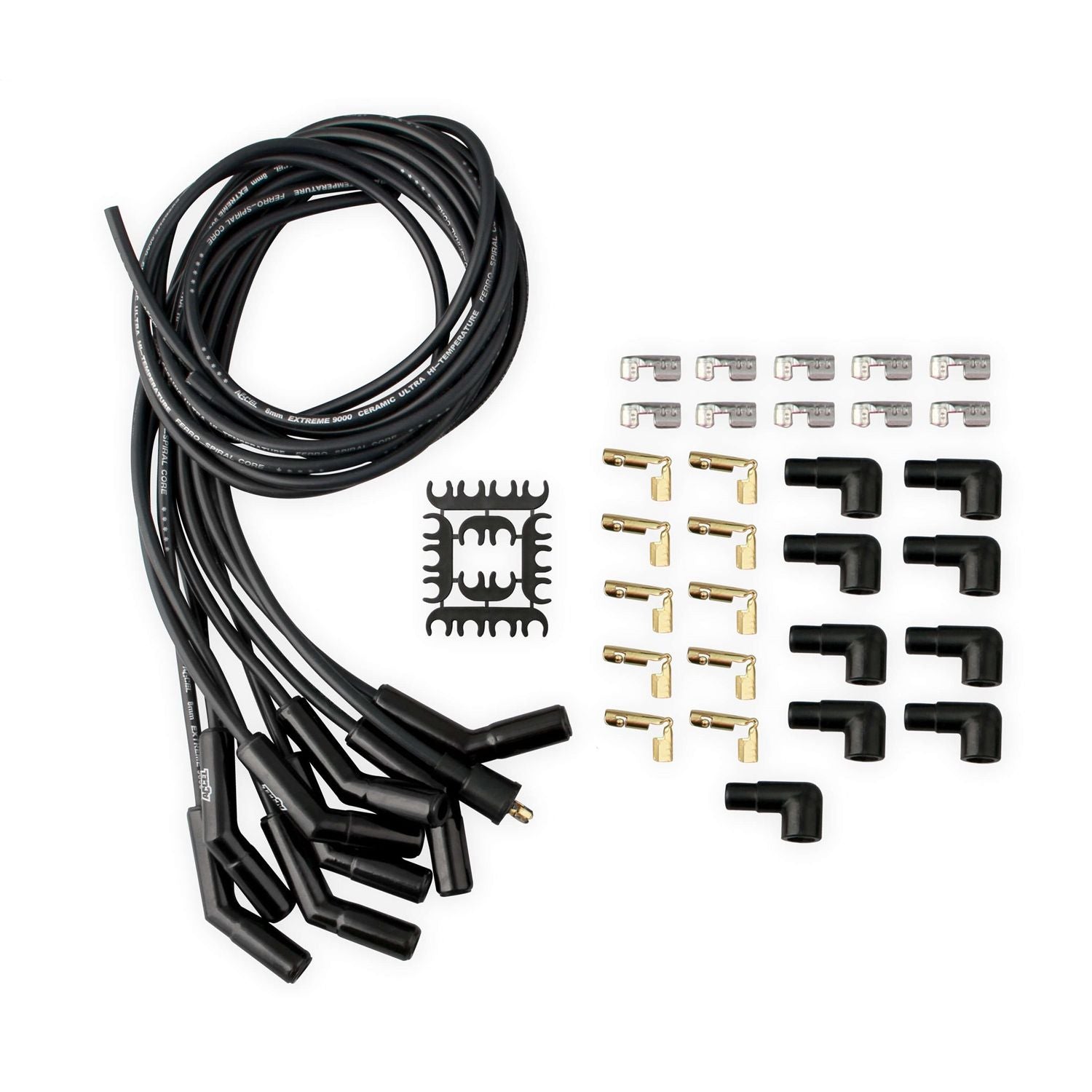 Do you want to put headers on your vehicle, but are afraid you may cook the spark plug wires? Just looking for a nice upgrade for your stock spark plug wires? If you answered yes to any of these questions, ACCEL has the wire set for you. Introducing ACCEL Extreme 9000 Ceramic Boot wires in Black! ACCEL Extreme 9000 Ceramic Boot Wires feature ultra high-temperature, double silicone, 8mm, 500 ohms/ft Ferro-Spiral core wire developed for performance use. The wire is rated at 600 degrees Fahrenheit peak and the black Ceramic boots withstand up to 2,000 degrees. Great for running headers with close tolerances, an engine bay with little room or an application with high under-hood temps. ACCEL Extreme 9000 wires offer excellent energy delivery to the spark plugs through stainless steel spark plug terminals, while providing the highest level of RFI/EMI suppression.