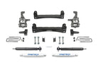 This system feature Fabtech?s proven IFS technology with extended length ductile iron steering knuckles for proper Ford electronic stability control functionality. Heavy duty 1/4? thick steel lower control arm crossmembers provide superior ground clearance for adventurous offroad trails. Rear lift is accomplished with a 2.25? lift block and extended length u bolts. The Basic System includes front coilover spacers that utilize the factory Coilover shocks for a stock like ride characteristic. Rear Performance twin tube shocks are included. This high quality system does not require drilling or cutting for installation and comes Fabtech?s 5/60 Powertrain warranty. 1/4? thick steel lower control arm crossmembers are arched for maximum ground clearance. Four adjustable alignment cams provide a wide range of adjustment. The fully welded box design of these crossmembers provides additional strength to the front suspension. Extended length ductile iron steering knuckles retain near stock track width keeping the tires under the fenders. These steering knuckles are designed to work in conjunction with the Ford ESC for proper functionality at all speeds. The Brake Line Brackets reposition the factory Ford brake lines down on the frame for the new travel range without having to open the brake system. Keeps factory fluid system intact. 1/4" thick steel drop brackets reposition the front sway bar for the increased ride height. This allows the sway bar link ends to fully cycle without binding throughout the extended travel range. 2.25" Tall rear lift blocks replace the factory blocks without changing the ride quality or load carrying capacity. American made U Bolts that retain the entire rear differential to the vehicle. A critical part that demands the best quality for your vehicle.