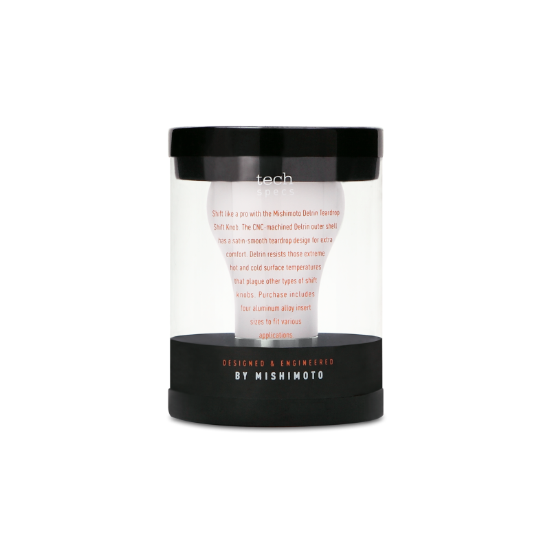 Mishimoto's teardrop shift knob puts a little twist on a classic design. The 2-piece hybrid design incorporates a heavy stainless steel core and a thermoplastic outer shell. The thermoplastic material provides protection against extreme surface temperatures. The thermoplastic shell is available in black or white to help match the style of your interior. This teardrop shift knob weighs in at 294g to provide precise and accurate shifts. This shifter features a plastic insert with three set screws for fitment onto unthreaded shift leavers along with four plastic threaded inserts to allow for fitment on various other vehicles.
