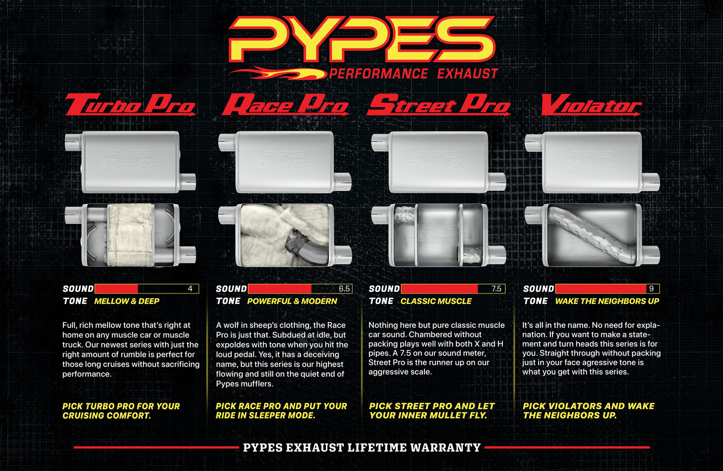 Need a 3 inch exhaust system, but are concerned about the fit around your shocks and/or gas tank? With plenty of flow to handle the horsepower and a fit that rivals OEM, the new Pypes 3 inch Hybrid systems combine the best of both worlds.Characteristics: