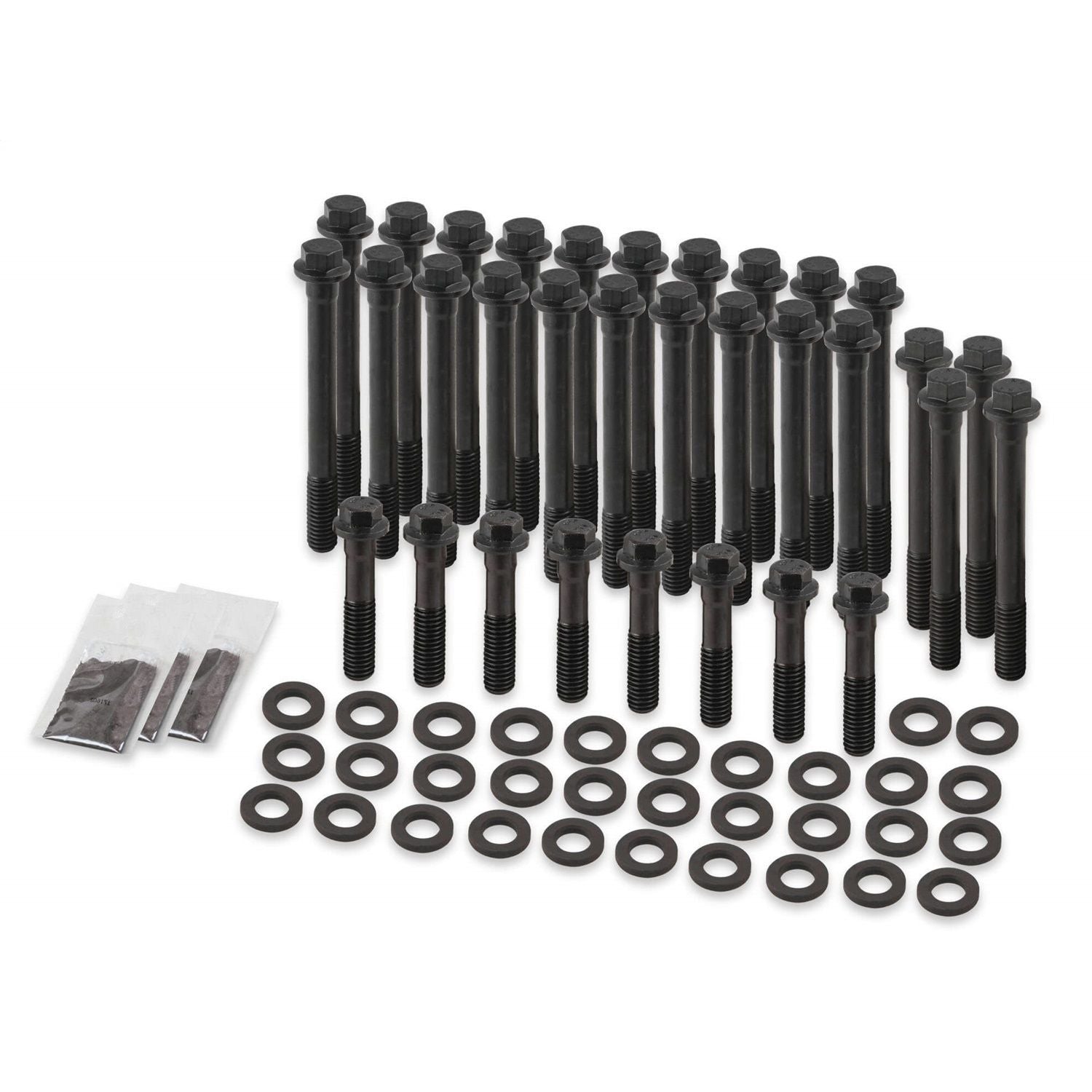 Earl's Racing Products head bolts are made from premium quality 170,000 psi chromemoly alloy steel (about 15% stronger than Grade 8). These bolts have a reduced wrench size (choose from 12-point or hex head) for extra socket clearance (provides extra clearance to rocker arms when re-torqueing heads). The wide flanged head provided more support for the extra thick chromemoly washers. These head bolts are reusable and are the ideal way to upgrade the performance of your engine, and eliminate the hassle and cost of replacing OEM style torque-to-yield style bolts each time the cylinder heads are removed. Black oxide finish & sold in complete engine sets.