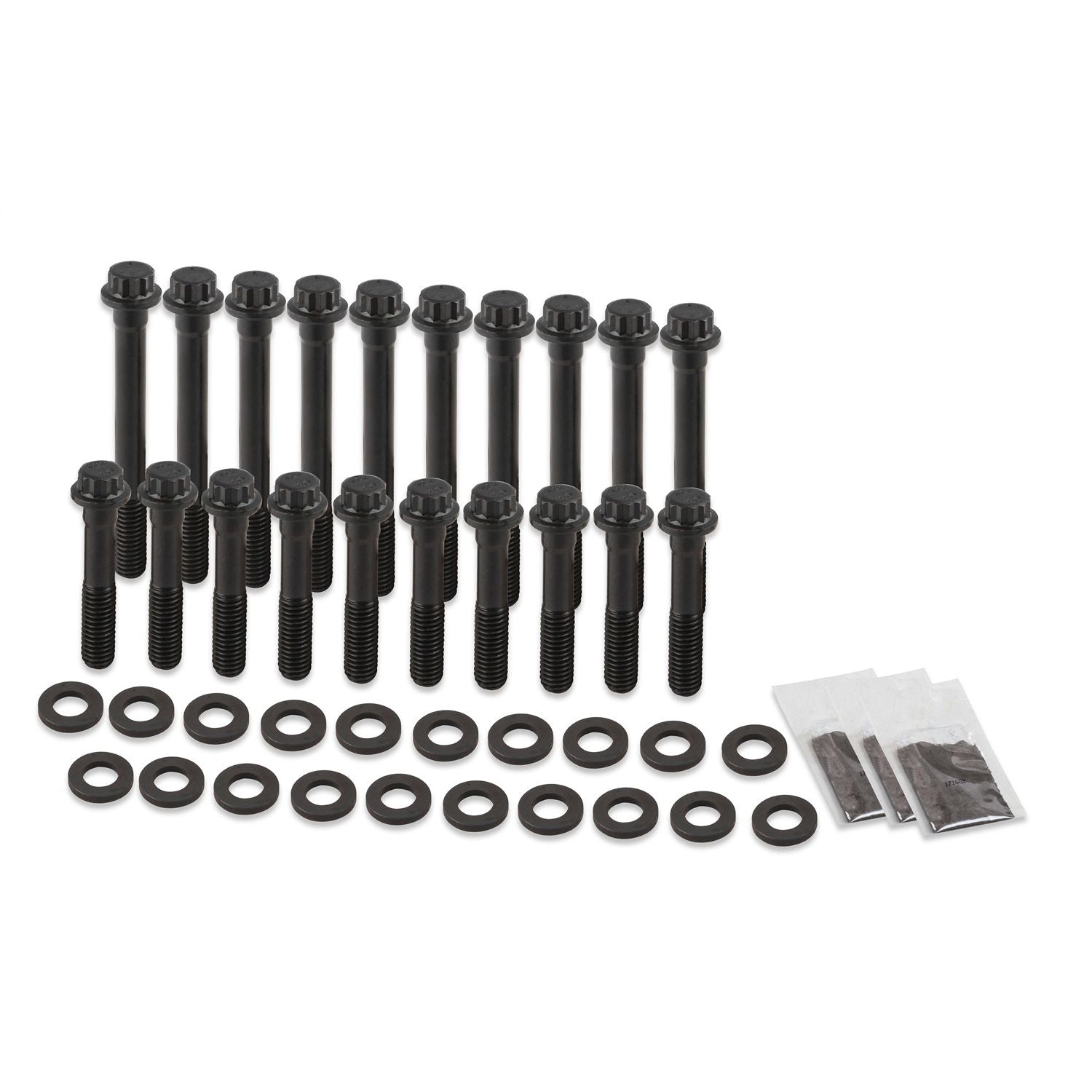 Earl's Racing Products head bolts are made from premium quality 170,000 psi chromemoly alloy steel (about 15% stronger than Grade 8). These bolts have a reduced wrench size (choose from 12-point or hex head) for extra socket clearance (provides extra clearance to rocker arms when re-torqueing heads). The wide flanged head provided more support for the extra thick chromemoly washers. These head bolts are reusable and are the ideal way to upgrade the performance of your engine, and eliminate the hassle and cost of replacing OEM style torque-to-yield style bolts each time the cylinder heads are removed. Black oxide finish & sold in complete engine sets.