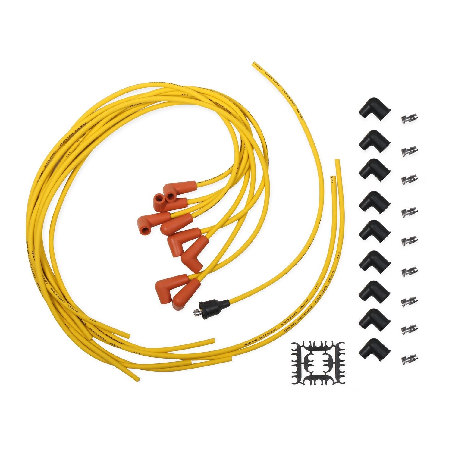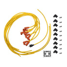 Upgrade for pre-HEI street applications, silicone jacket with fiberglass braid is rated at 450 degrees Fahrenheit, tinned copper core. Includes 8 blue extra-long wires, coil lead, silicone boots, zinc-plated steel terminals. Requires terminal and boot installation on distributor end of wires.