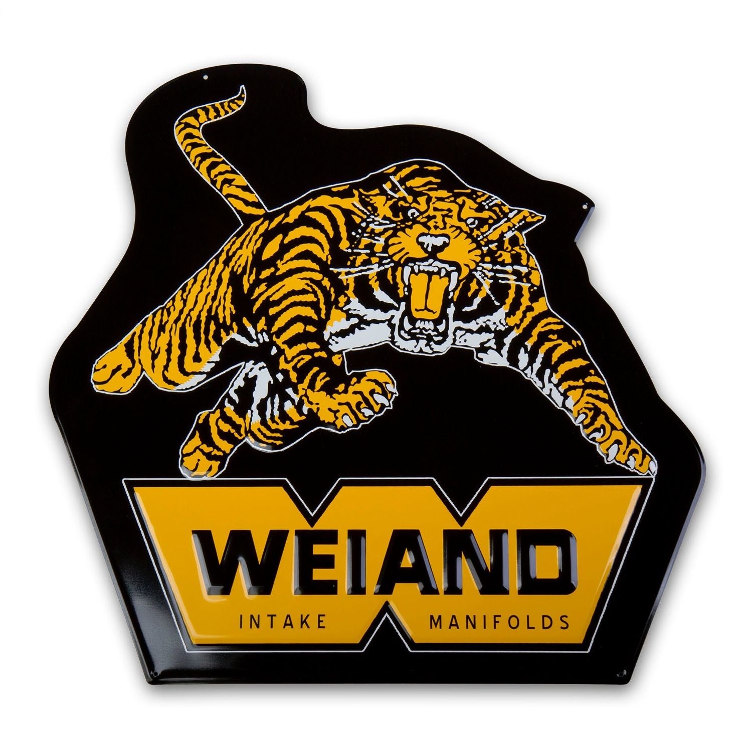 Weiand introduces the recreation of their early '70s Tiger logo. If this sign looks familiar, it's because the design appeared in the movie Funny Car Summer 1974. Leap back in time with this new metal sign.